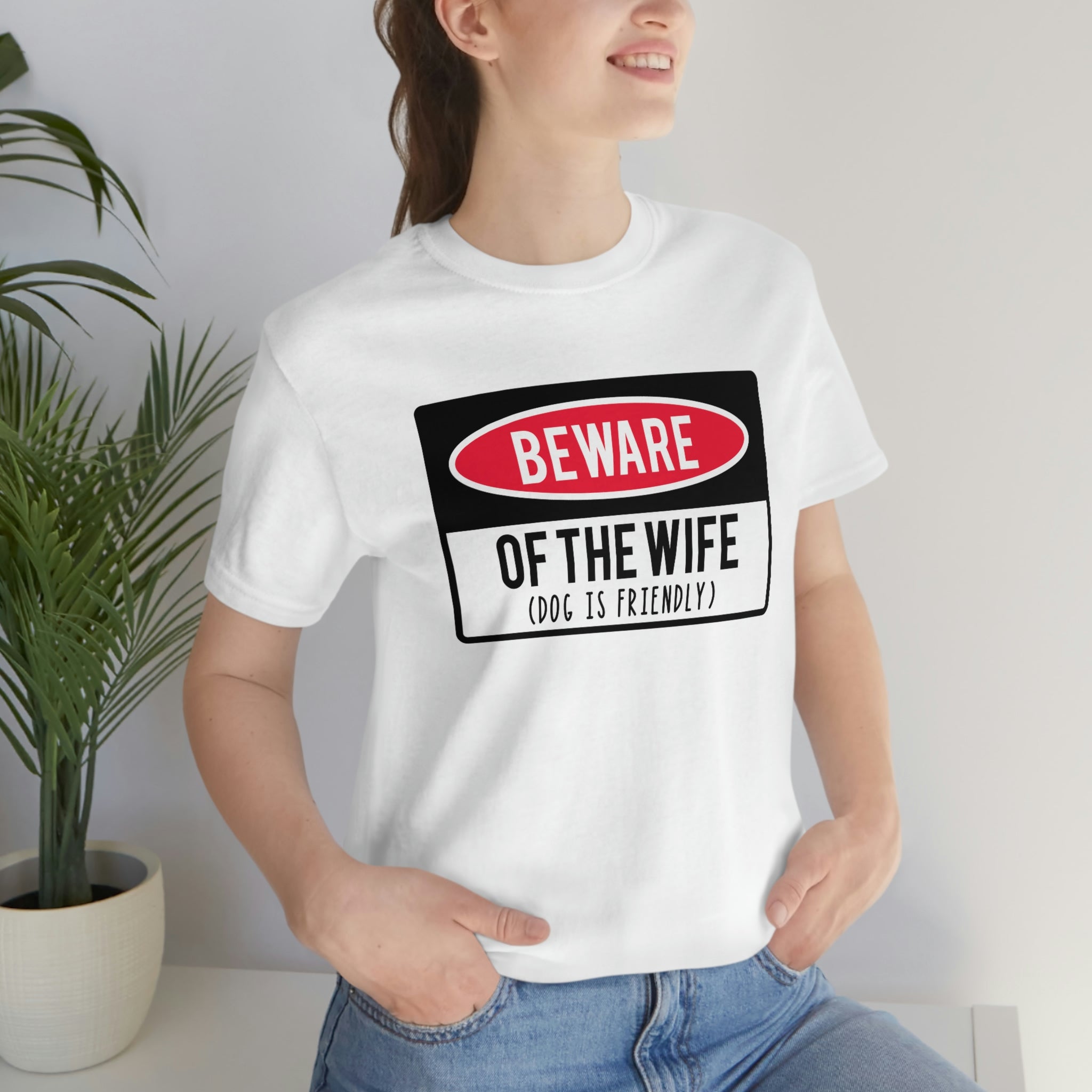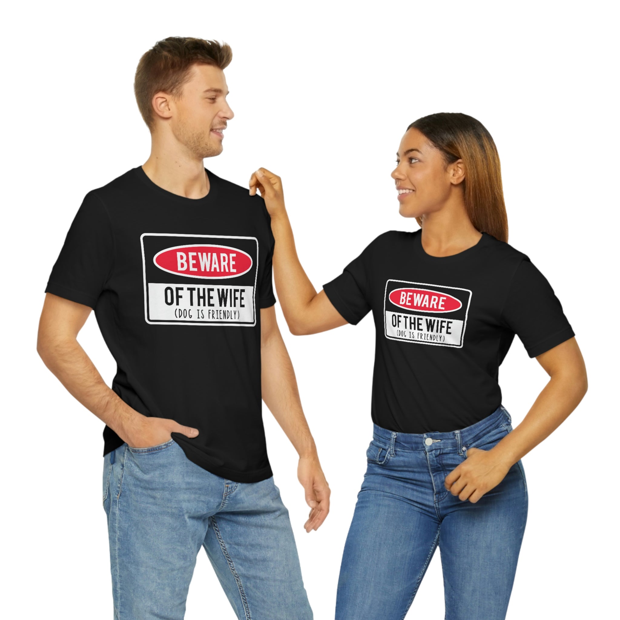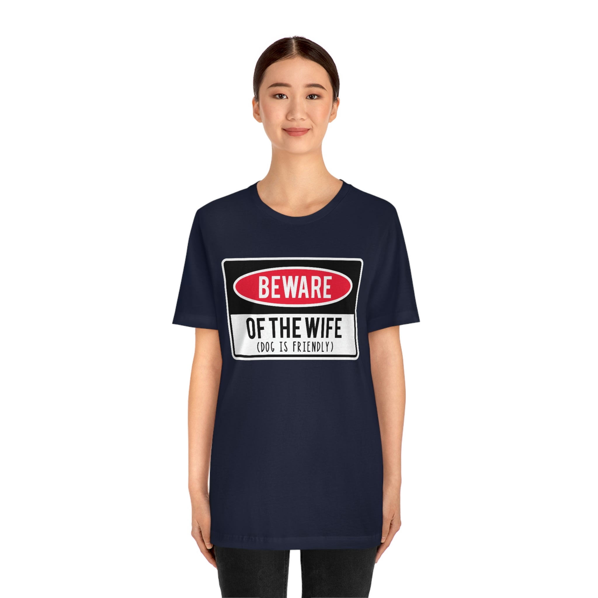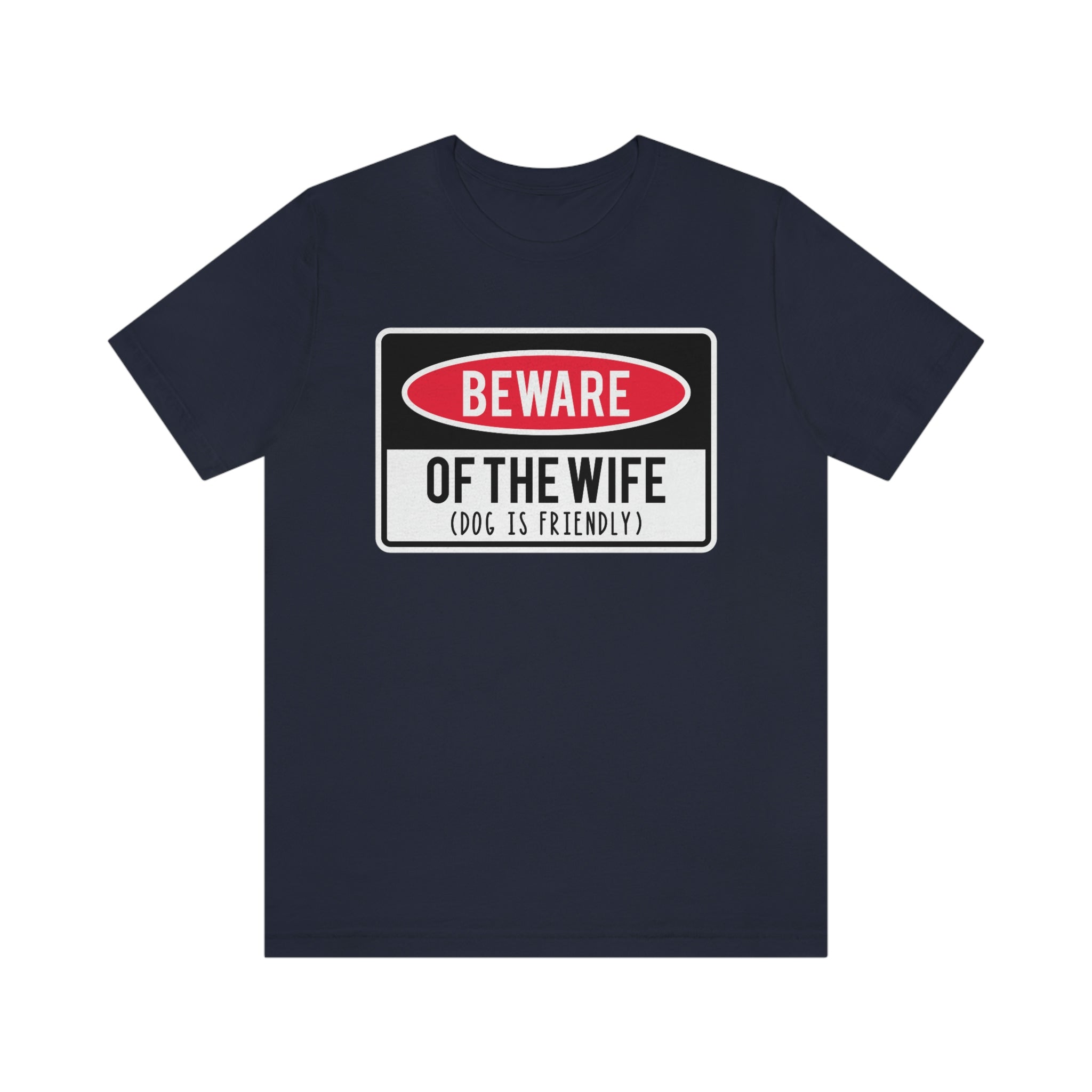 This men's Bella + Canvas t-shirt features a humorous graphic that reads "Beware Of Wife (Dog is Friendly)". The shirt is made with high-quality materials for a comfortable and long-lasting wear. Perfect for anyone with a sense of humor and a love for dogs and their wife lol .: 100% Airlume combed and ringspun cotton (fiber content may vary for different colors) .: Light fabric (4.2 oz/yd² (142 g/m²)) .: Retail fit .: Tear away label .: Runs true to size
