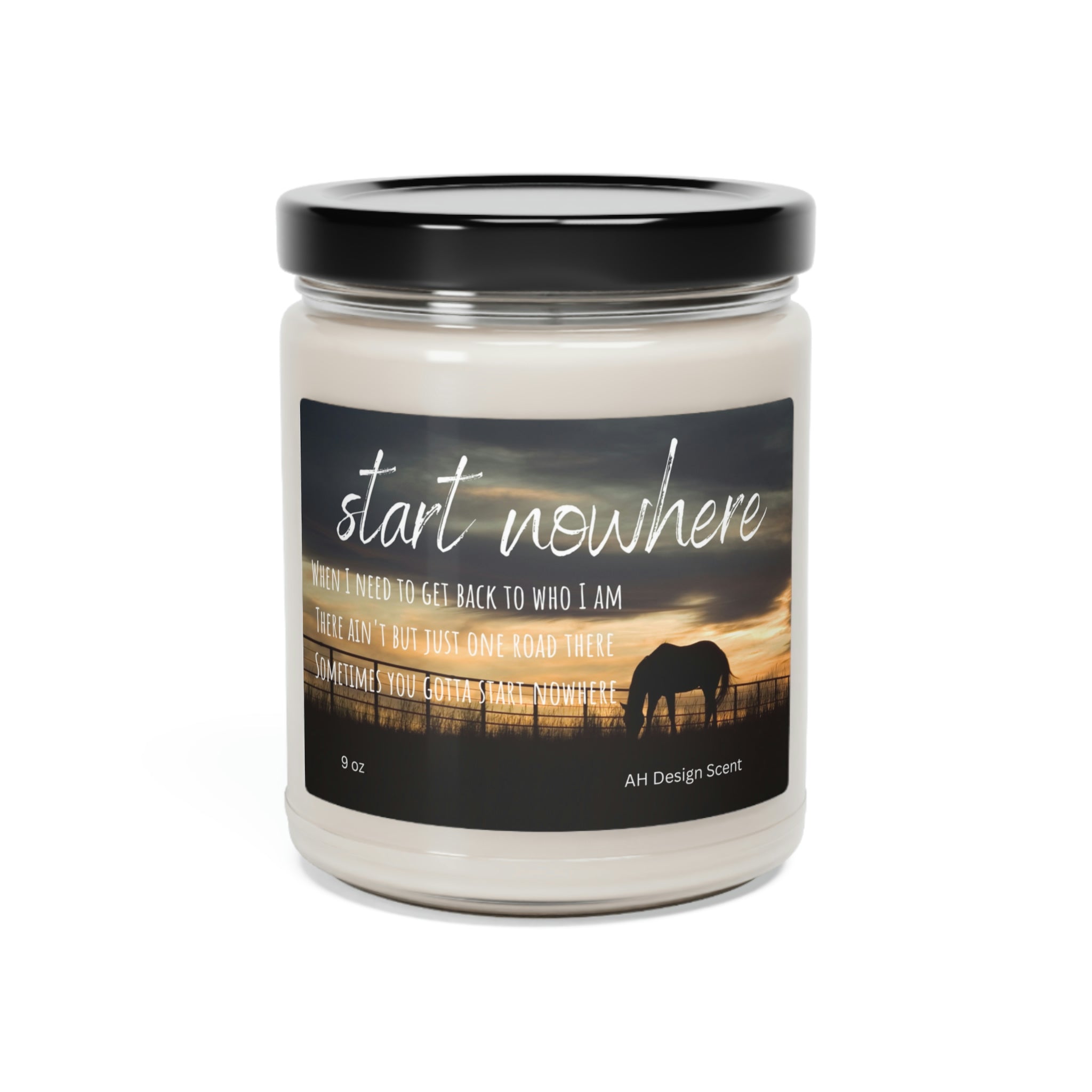 Scented Soy Candle, 9oz, Start Nowhere, Country Music, Country Music Lyric, Country Candle, Gifts for her, Country Fan Packed with immersive aromas, these scented candles come in 9oz glass jars and are one size (2.8″ × 3.5") (7.1cm × 8.8cm). Made with 100% natural soy wax blend, each candle features a 100% cotton wick and a permanent adhesive label where your custom designs can come alive. .: Materials: 100% natural soy wax blend, 100% cotton wick and a glass jar .: One size: 2.8″ × 3.5" (7.1cm × 8.9cm) .: Glossy permanent adhesive label .: Choose from five different aromatic scents .: Assembled in the USA from globally sourced parts .: NB! All scents have the same wax color