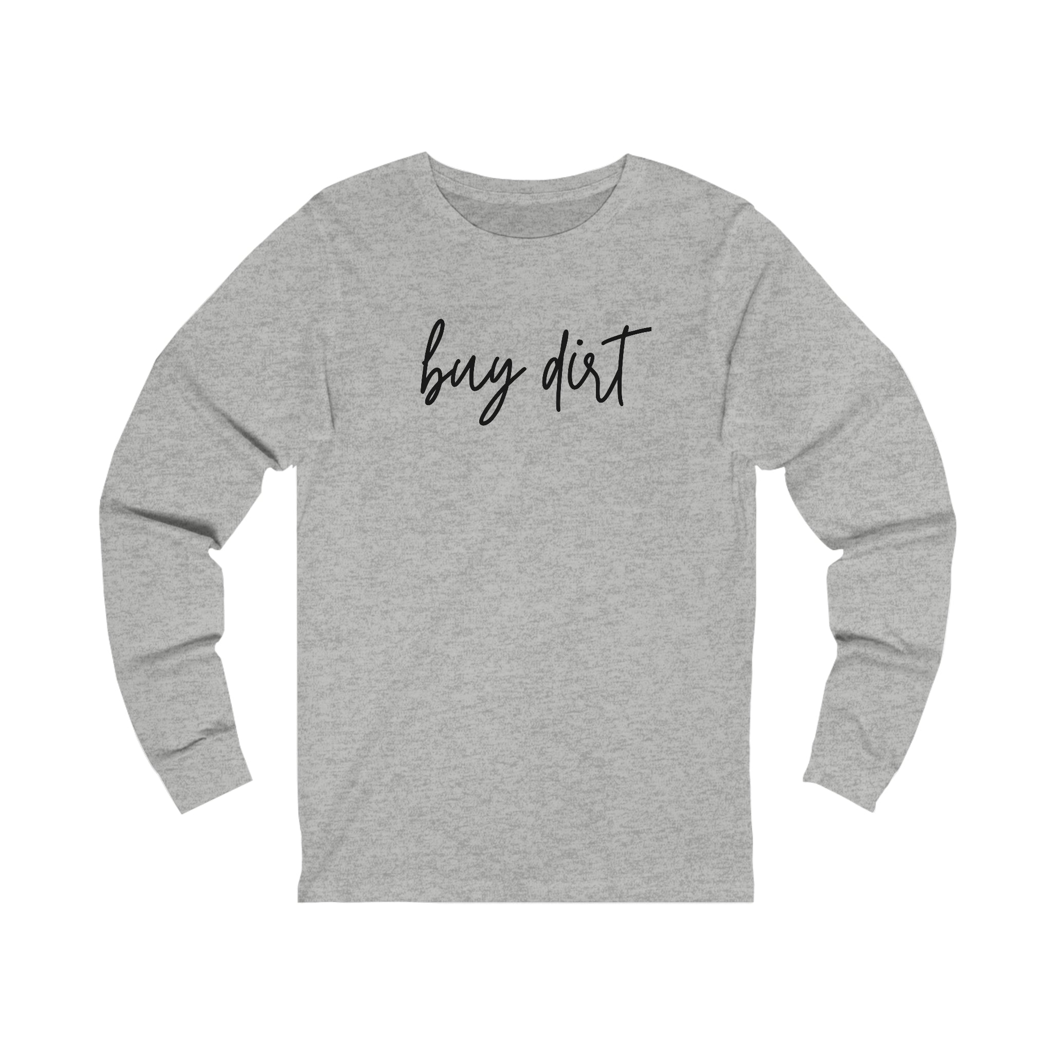 Rock your love for Jordan Davis and Luke Bryan's hit song "Buy Dirt" with our exclusive long sleeve tee. This bella + canvas shirt features the iconic lyrics "BUY DIRT" beautifully printed on the front, making it a must-have for fans of these talented artists.