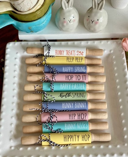 Our mini rolling pin is the perfect size for any Easter or Spring themed tiered tray or riser. 7" long and 1" high.