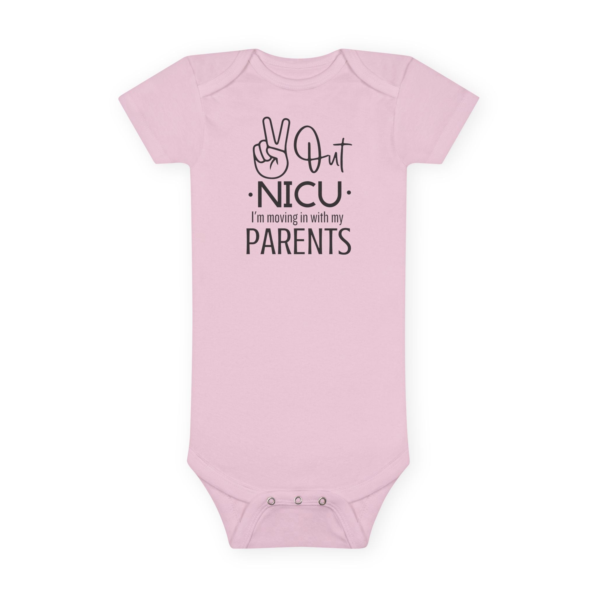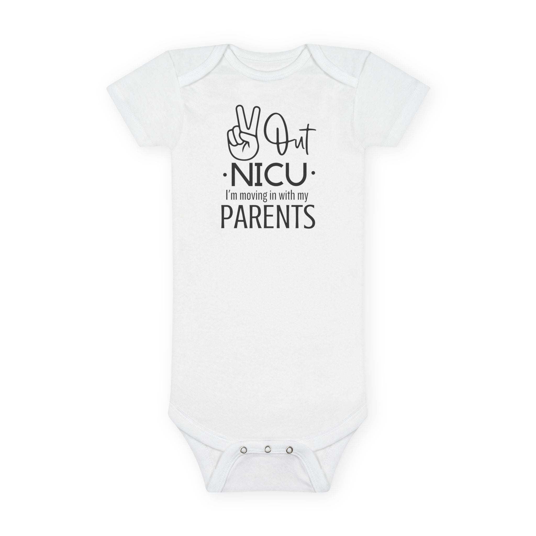 The custom short-sleeve baby Onesie® is built from 100% cotton rib. This makes for a comfortable, secure fitting for newborns and toddlers. The neckline is constructed with a lap shoulder. This inclusion assists with manipulating the fabric around the baby’s head. The bottom has a snap closure - designed with easy changing in mind. Both legs have ribbed openings for stability.