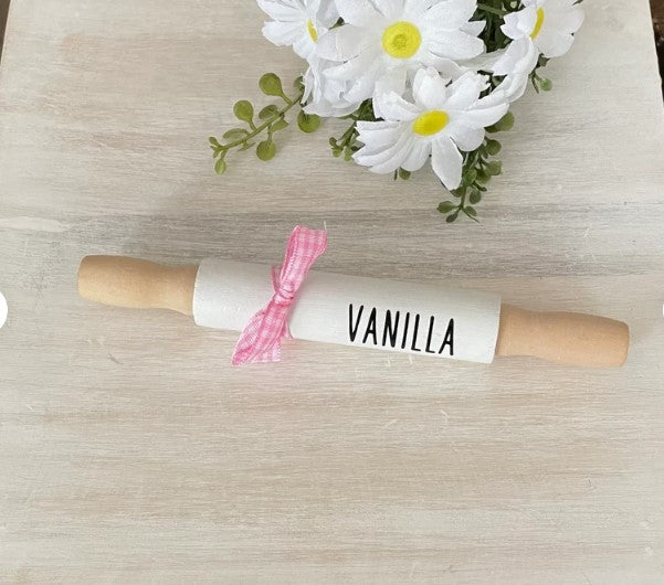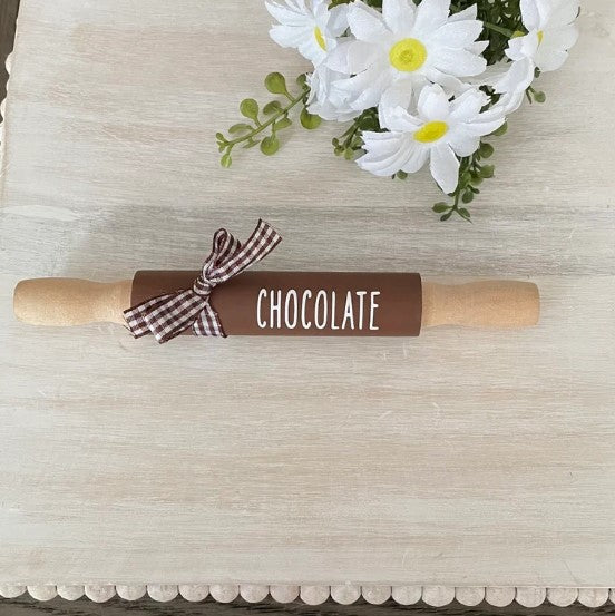 Wooden rolling pin is hand painted by me. I have added a vinyl decal to them and a gingham bow. Rolling Pin is 7” long.
